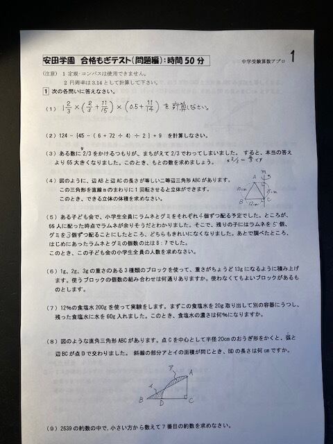 面積・体積と表面積・数に関する問題・速さ(グラフなし)を重点的に演習。