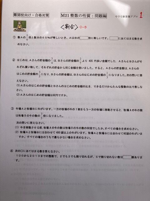 中学受験・難関校向け 算数特訓プリント 数量(整数の性質、割合)