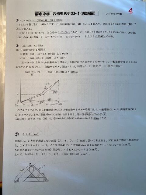 ◎特訓プリント:130G数に関する問題、240G速さ(グラフなし)、330I面積、310F平面図形の性質